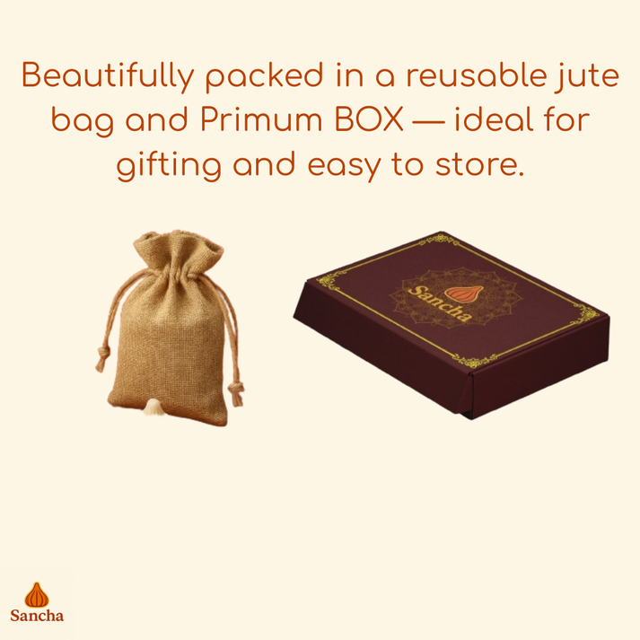 Beautifully packed in a reusable jute bag and BOX — ideal for gifting and easy to store.